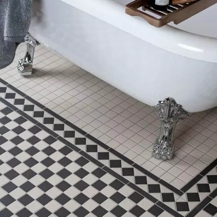 Rotating the mosaic sheet 45 degrees creates a diamond orientation across the floor. This works well in square shower trays and adds visual movement without additional materials.