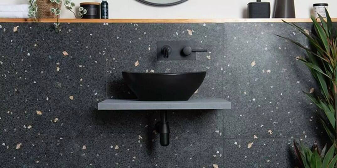 Dark-base terrazzo is bold. It carries the same spatial considerations as black tiles – it needs strong lighting, contrast surfaces, and a clear commitment to the aesthetic. Used with confidence, it produces a bathroom that looks nothing like anything else.